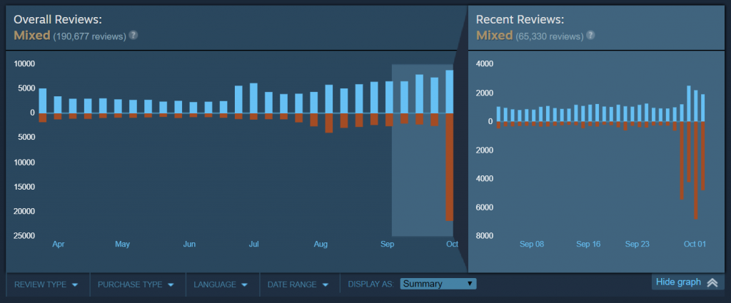 For those not in the know, ‘review bombing’ is the term given to mass negative reviews flooding a platform over a specific topic. It was rather effective in the case of PlayerUnknown’s Battlegrounds, as the complaints eventually led the developer to reflect on the state of the game and launch its “FIX PUBG” campaign. Other cases are not so relevant, as players review bombed Firewatch in response to developer Camp Santo’s takedown notice against PewDiePie.