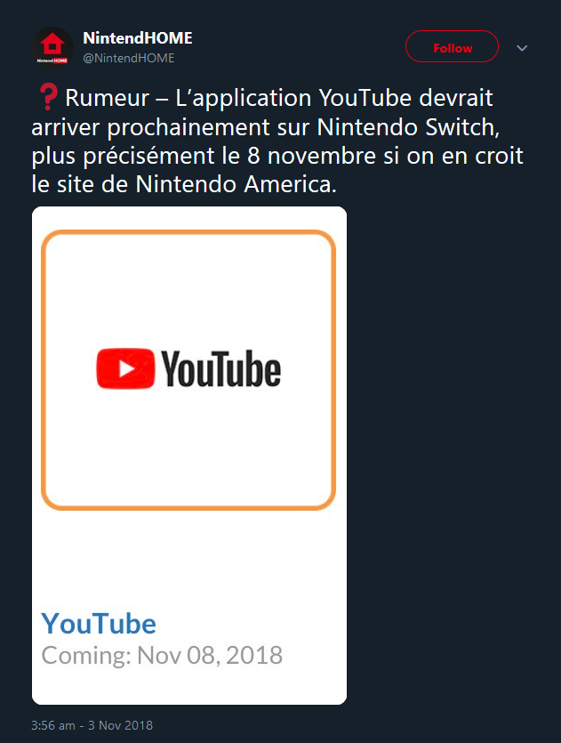 “Rumor – The YouTube app should arrive soon on Nintendo Switch, more precisely on November 8, according to the Nintendo America website,” reads Google translate. This was further endorsed by an admin of ResetEra, who seemingly confirmed its accuracy and expressed their excitement.
