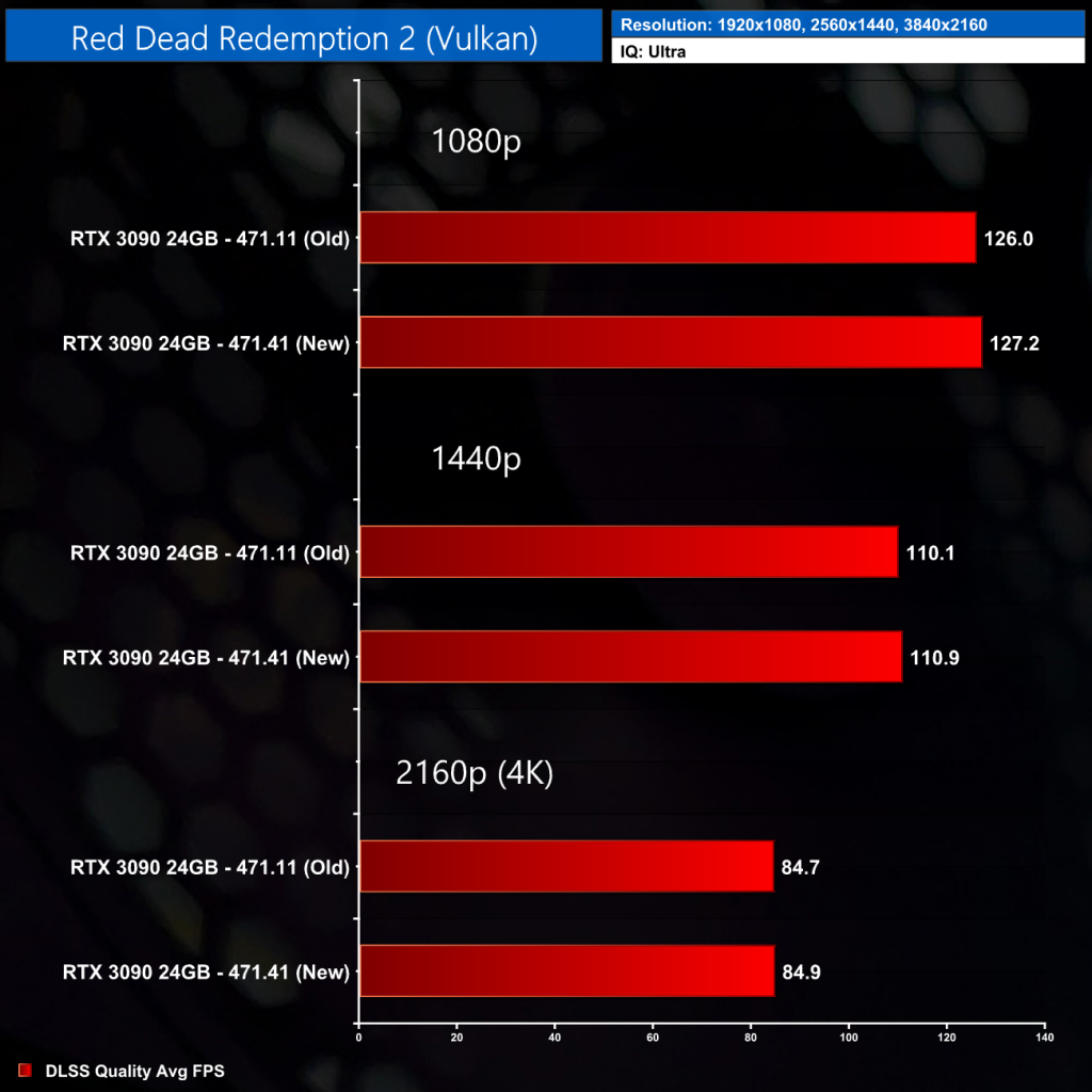 To see if that changed with the release of the 471.41 driver – our original testing was done with the 471.11 driver, the latest version until today – we re-ran our Red Dead Redemption 2 benchmarks using an RTX 3090 at 1080p, 1440p and 4K, all using DLSS Quality mode. Below you can see the benchmarks from the previous 471.11 driver compared against the new results with the 471.41 driver.
