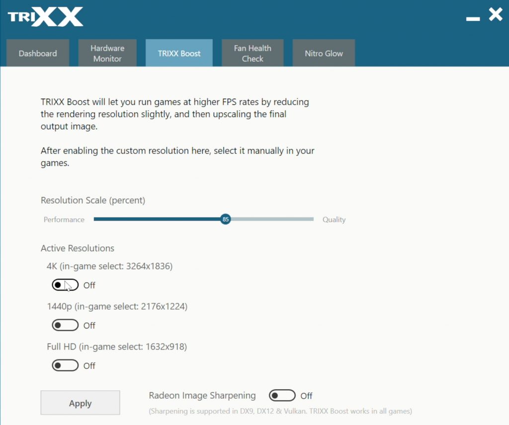 To be clear, TriXX Boost is not a revolutionary new feature that Sapphire has developed which fundamentally changes how games will be played. Instead, it is simply a case of setting a custom resolution based on a resolution scale slider which is adjustable in TriXX. There are other ways to set custom resolutions – some games even have resolution scaling built-in – but TriXX boost makes the process very easy.