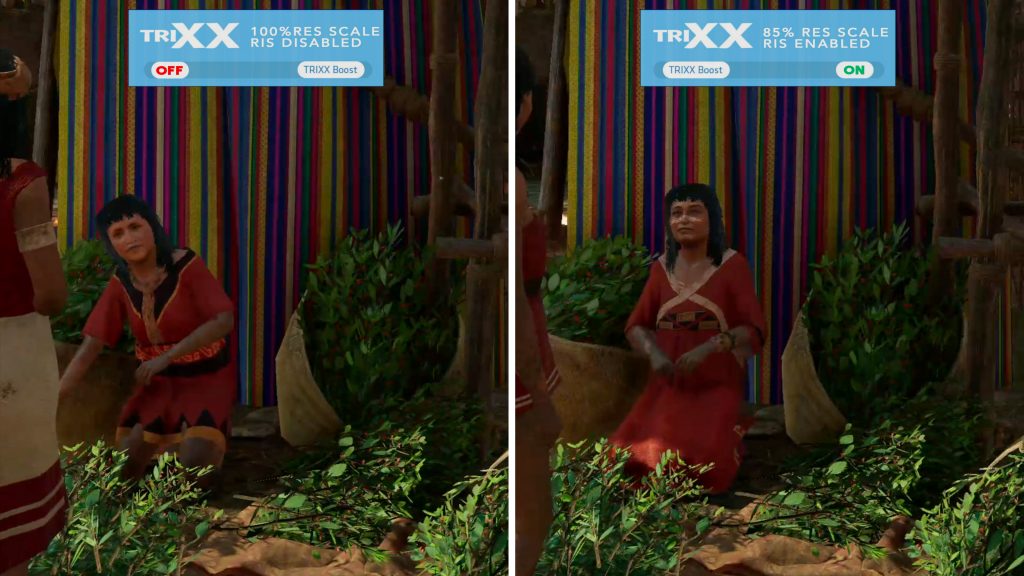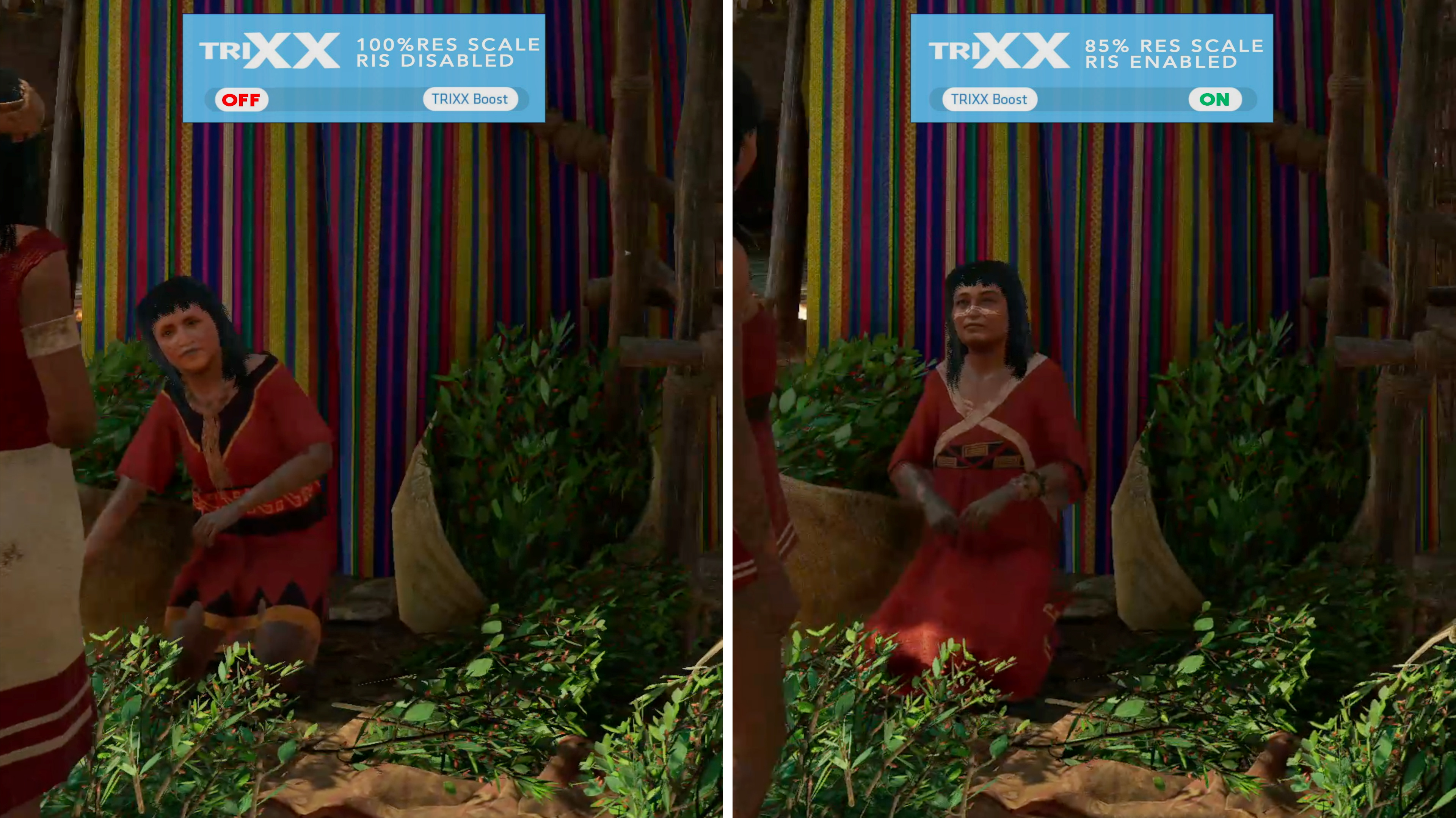 Things goes the opposite way with this next example, where the native 4K image just looks very soft – focus on the lady's face, and her features are barely distinguishable. The image with Trixx Boost and RIS, though, looks a lot clearer and sharper. I would say that the hair again looks more natural at native 4K, as sharpening this results in a grainy appearance. It's still a great result for TriXX Boost though.