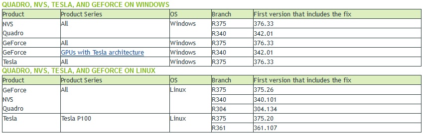 Most of the issues were present in the Windows version of Nvidia's display driver but there was also a vulnerability discovered in Nvidia's Linux driver. To get the fixed drivers, here are the versions you will need depending on which product and OS you are running: