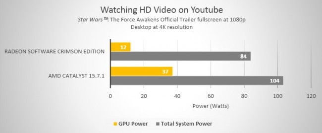 On top of that, system power draw has also been a big focus. Radeon Software: Crimson Edition will control power usage in more scenarios with R9 300 and Fury series GPUs. This includes simple tasks like watching HD video on YouTube. As the graph above shows, AMD is touting a 20W power saving for the entire system between Radeon Software and Catalyst Control Centre while watching a 1080p video on YouTube.