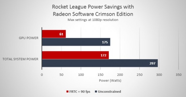 Frame Rate Target Control (FRTC) can also now be utilised in DirectX 9 titles, which can lead to power savings. Limiting Rocket League to 90 frames per second at 1080p yielded some pretty positive results, according to AMD's own test, showing a total system power saving of 125W simply by limiting the frame rate, in a system using an Intel Core i7 5960x CPU, 16GB of DDR4 RAM and an R9 Fury X.