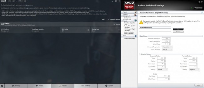 The new display settings window consolidates what used to be three separate tabs in to one screen. The basic window allows you to set up FreeSync and Virtual Super Resolution- which can now be used on the desktop to give lower resolution displays more screen real-estate for multitasking. However, clicking on the ‘additional settings' option will bring up the old UI, with access to other features like custom resolutions, or setting your preferred colour depth.