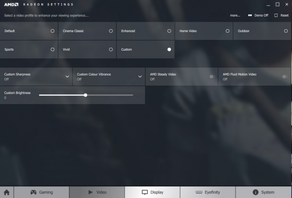 The new video settings tab lets you customize the video playback experience, with settings for brightness, AMD's ‘fluid motion' video technology, vibrance and sharpness. Most people will leave this on the default setting, though there are plenty of options for those who know what they are doing.