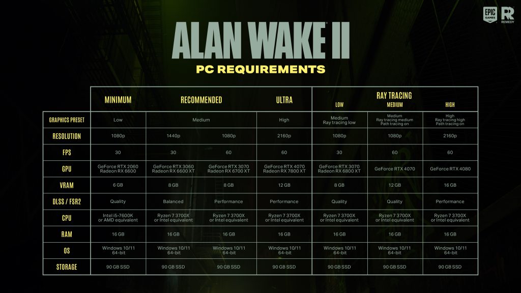 Regardless of the settings you plan to use to play Alan Wake II, it's always recommended to have an SSD with 90GB of free storage space. Alan Wake II will be released on October 27th for PC, PlayStation 5, and Xbox Series X|S.