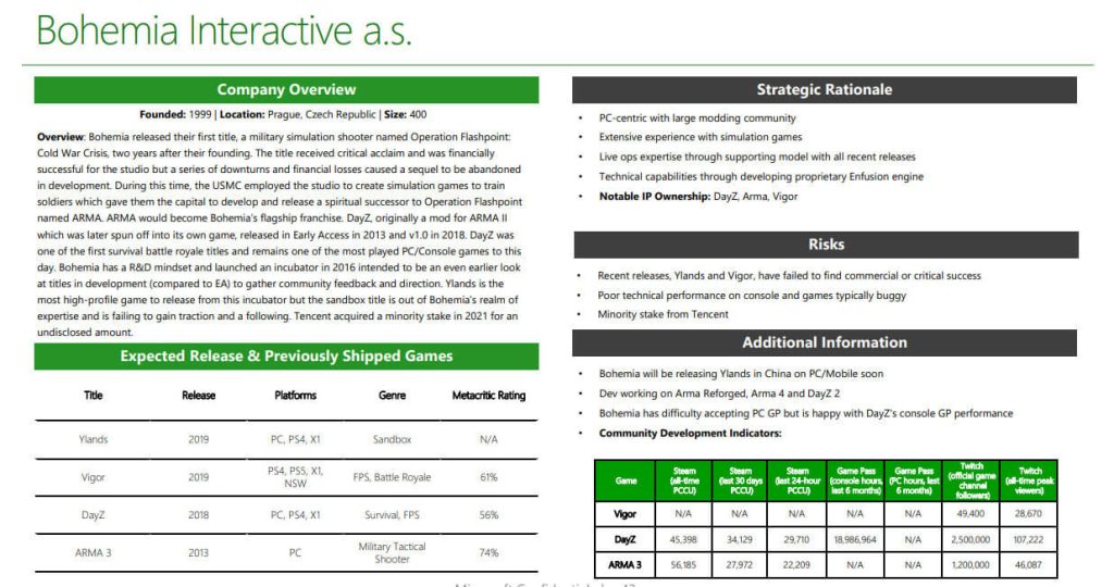 One Microsoft summary card (via DSOG) shared during the hearing provides information about Bohemia Interactive, the developer behind popular titles such as ArmA, DayZ, and Vigor. The document mentions that DayZ remains one of the most played survival games, with over 34,000 peak concurrent players in the 30 days prior to the submission and just under 19 million console hours logged. The document also confirms that DayZ 2 is currently in development, along with ArmA Reforged and ArmA 4.