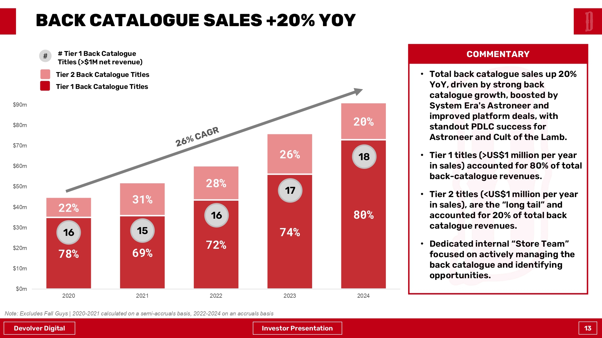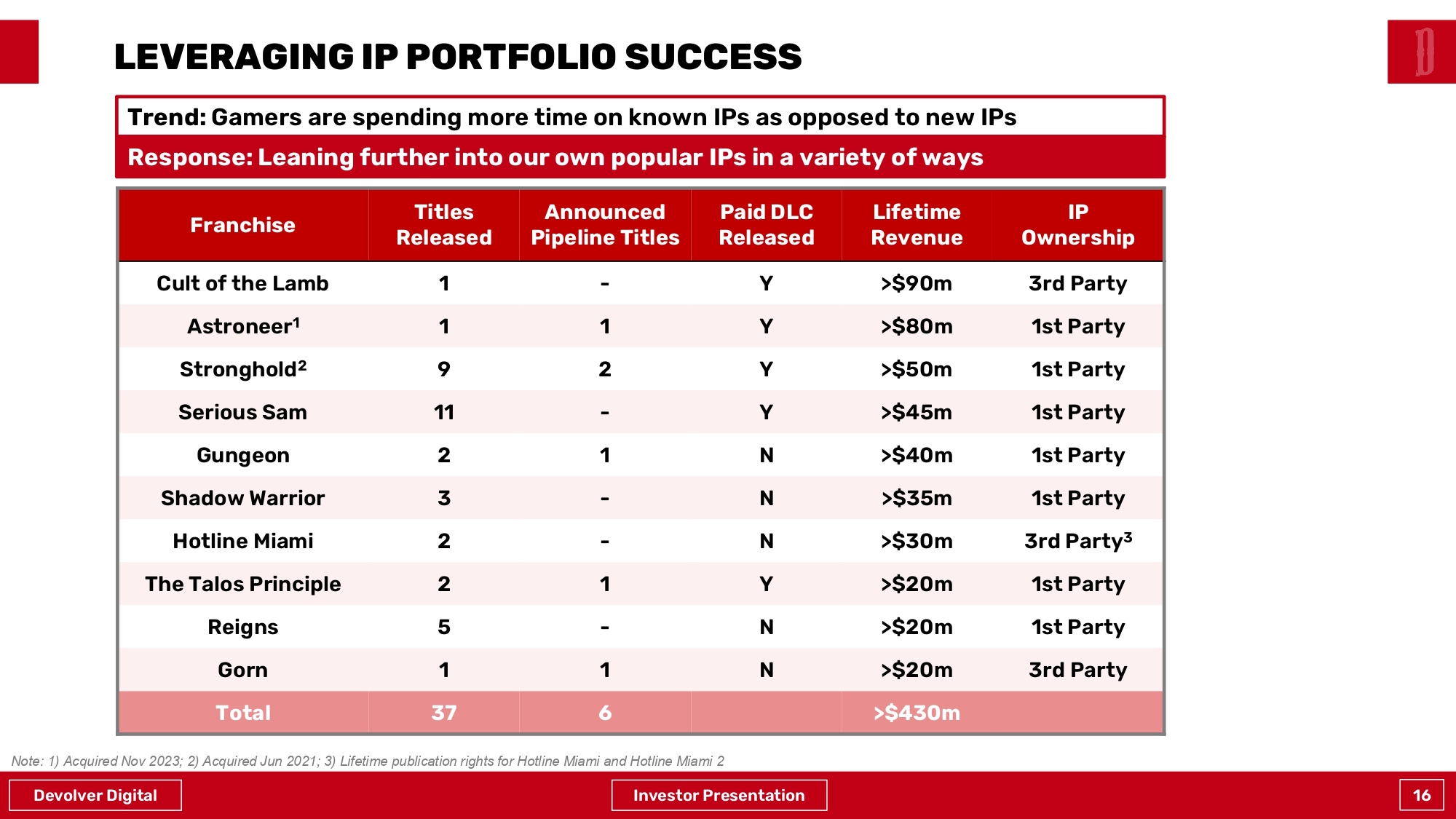 Beyond Cult of the Lamb, the sandbox adventure game Astroneer has also proven to be a strong performer, generating nearly $80 million in lifetime revenue. Astroneer became a first-party brand for Devolver Digital following the acquisition of its developer, System Era Softworks, in November 2023. The game's first paid DLC, Glitchwalkers, launched in 2024 and contributed to a 20% year-over-year increase in Devolver Digital's overall back catalogue sales, demonstrating the continued revenue potential of established titles through paid expansions. Stronghold, a franchise developed by Firefly Studios and acquired by Devolver Digital in 2021, has also achieved significant financial success, generating over $50 million in lifetime revenue. Other IPs from Devolver include Serious Sam, Gungeon, Shadow Warrior, Hotline Miami, The Talos Principle, Reigns and Gorn (in descending order for highest revenue).