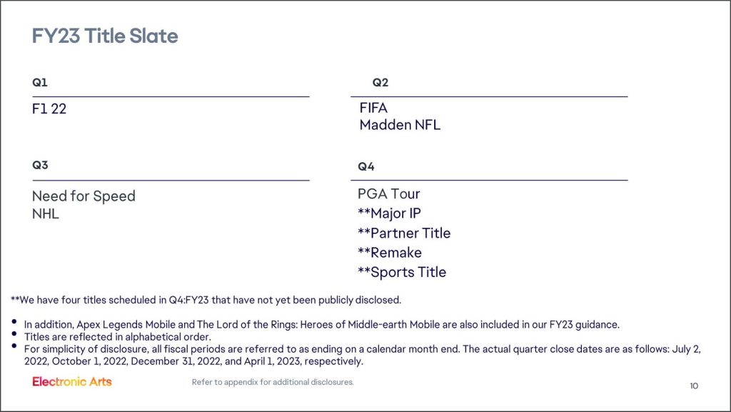 In the first quarter of the fiscal year of 2023, EA will be launching Apex Legends mobile and F1 2022, coming on July 1st. In the next quarter, we'll get the yearly Madden NFL release and the last FIFA made by EA Sports after 30 years of partnership with the football corporation. Finally, for Q3 of FY23, we'll get the much-anticipated Need for Speed developed by Criterion and a new NHL title.
