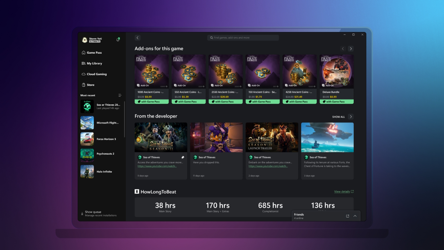 The Xbox App for PC gives you easy access to game hubs by simply clicking on a game in your library or the left sidebar. Once there, you'll find all the information you need about the game. Everything is just a few clicks away, from basic information on how to play, install, or update the game to alerts about discounts and available updates. You can also find add-ons and new content relevant to your game, along with the price and a buy link.