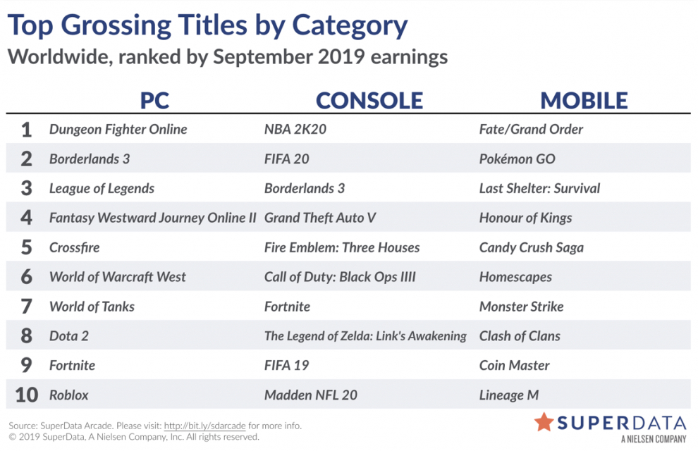 On the other hand, Borderlands 3, another new title for the list, sold around 3.3 million digital units on both PC and consoles in the past month. Fate/Grand Order had a good month too, nearly doubling the game's revenue to $246 million, in comparison with $131 million from the previous month and the $98 million in the last September.