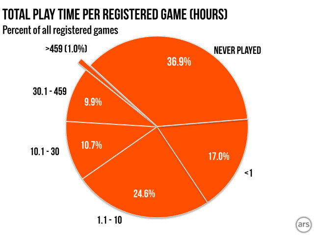 For example, 37 per cent of all games bought have never been played. While that number might seem high, consider the amount of games you've bought as part of bundles, or special sales packs, just because the deal was good – not necessarily because you wanted to play the game right then, though maybe you will later. It often doesn't turn out that way though and the game just sits there in your collection, gathering digital dust.