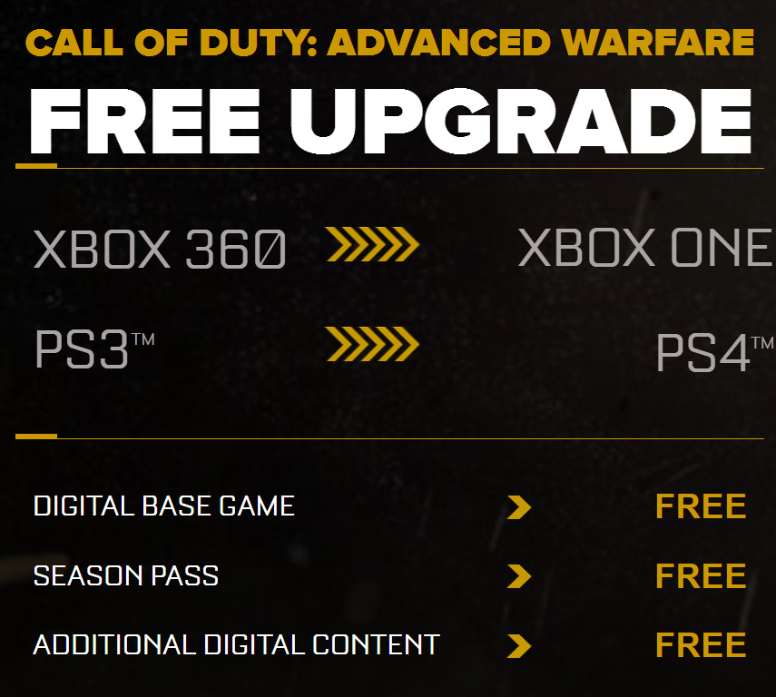 If you're a big console gamer but haven't yet upgraded to the latest generation, be it PS4 or Xbox One, then Activision is hoping to tempt you in to doing so, by offering a free upgrade to the new version of Call of Duty: Advanced Warfare. Buy any copy of the game from the last gen, whether it's Xbox 360 or PS3 and you'll get a free digital upgrade to the latest console version in the same family.