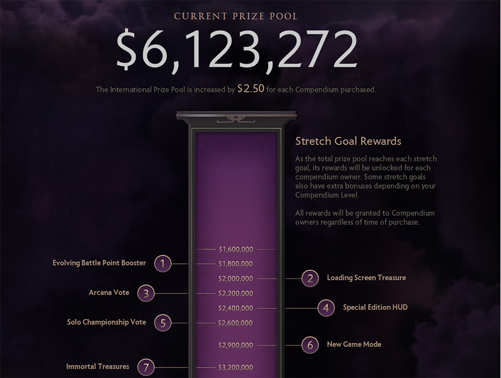 Sales of the DotA 2 Internationals Compendium have been continuing over the past few weeks and once again we've hit a milestone in prize pool size for a single Esports tournament. $6 million is the latest threshold to be burst through, with the current total sitting at $6,123,272 at the time of writing.