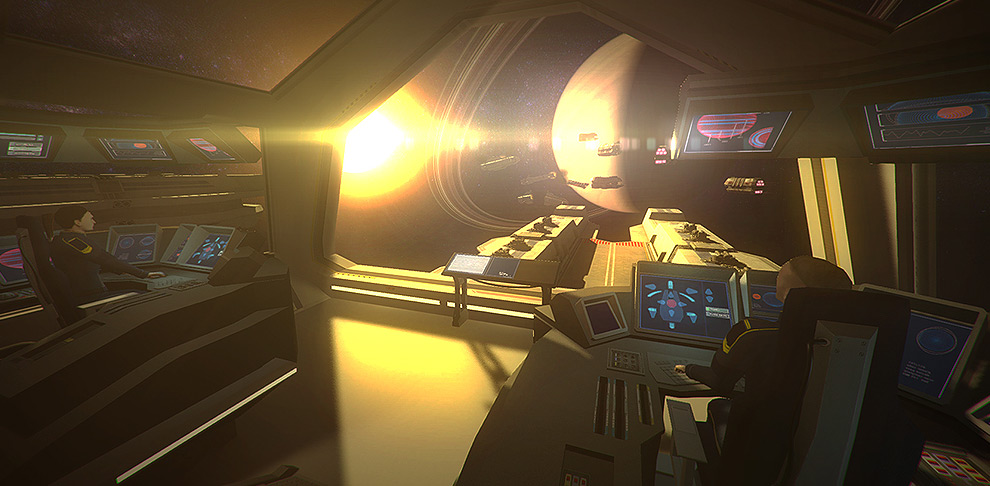 One of the core gameplay elements of the RTS, is that it's in fifth person, or seventh – essentially, up in the sky looking down. You tend to have a HUD with extra information on it and there might be some advisory character in the corner telling you what a mess you're making of things. However, that's not what Flagship does. Putting you in the first person perspective, aboard your very own starship, you control your forces on a 2D display in the middle of your command deck and then watch the battle play out, right through your window.