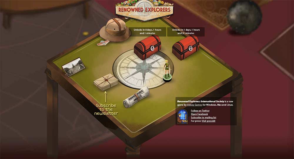 As part of the reveal, Abbey launched a new site which has thematic items related to the game sitting on a table. You can click these to interact, learning about explorer Elvy Erikkson, or explorer head gear, or take a look at the society's special badges, pin and all. More details are set to be revealed over the next couple of days.