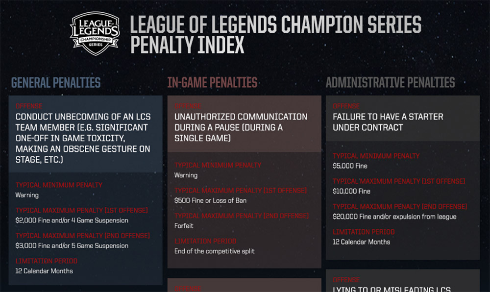 The new Penalty Index, as Riot has termed it, details three distinct categories of wrong doing: General Penalties, In-Game Penalties and Administrative Penalties. They run the gamut from failure to sign the right contract before joining the League Championship Series, to unauthorised removal of your headset before the end of a game.