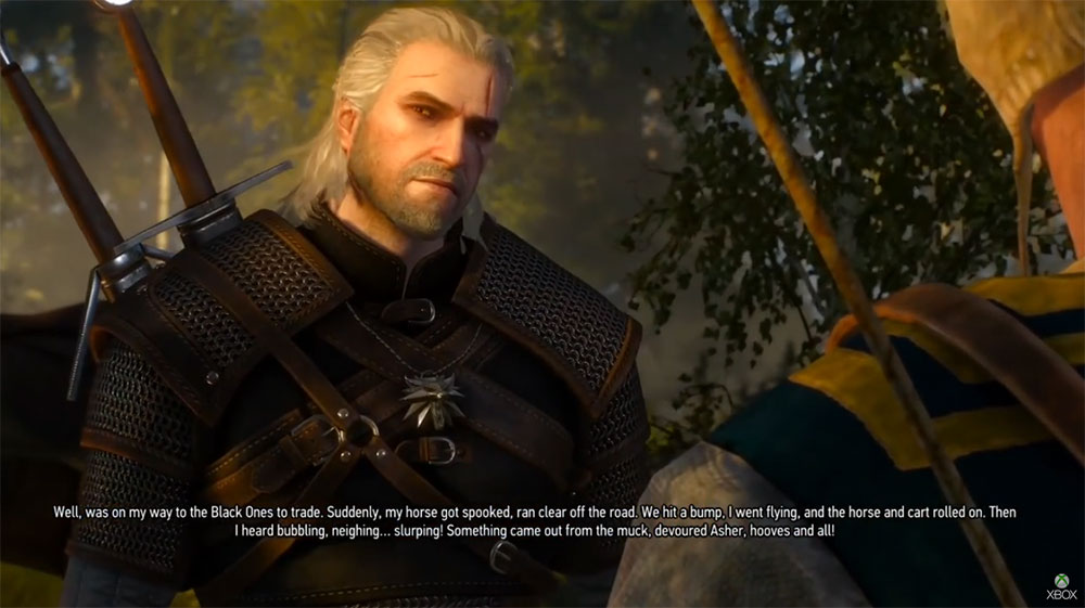 Whatever the intention, the footage shows our protagonist, Geralt the Witcher, travelling through the countryside during the prologue portion of the game. As a way of introducing questing and Geralt's gravelly voice, he meets a man who has had some trouble with a menacing beast at a nearby swamp, which supposedly ate his horse. Since the man didn't see it happen, you'd be right to be sceptical.
