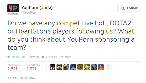 Original Story: Are you an aspiring eSports team or player of games like Starcraft II, League of Legends, DotA 2 or Hearthstone? Have you struggled to get sponsored? Well there's a new kid in town that's looking to pony up some cash for top players, as long as they don't mind being associated with pornography. YouPorn, the… site, that some of us visit on a regular basis, has announced that it's looking to sponsor eSports teams.