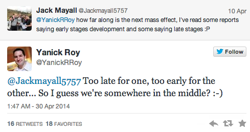 According to a tweet from BioWare Montreal Studio Director, Yanick Roy, the game is “somewhere in the middle” stages of development.