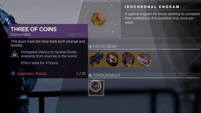 Bungie has confirmed that the Three of Coins consumable is bugged at the moment. According to the studio, this item is supposed to provide a 50 percent increase to the chance of an exotic engram dropping upon activity completion. However, this bump was not activating when running through Heroic Strikes. The studio seems to be adamant that it is working in other areas, despite players reporting poor results.