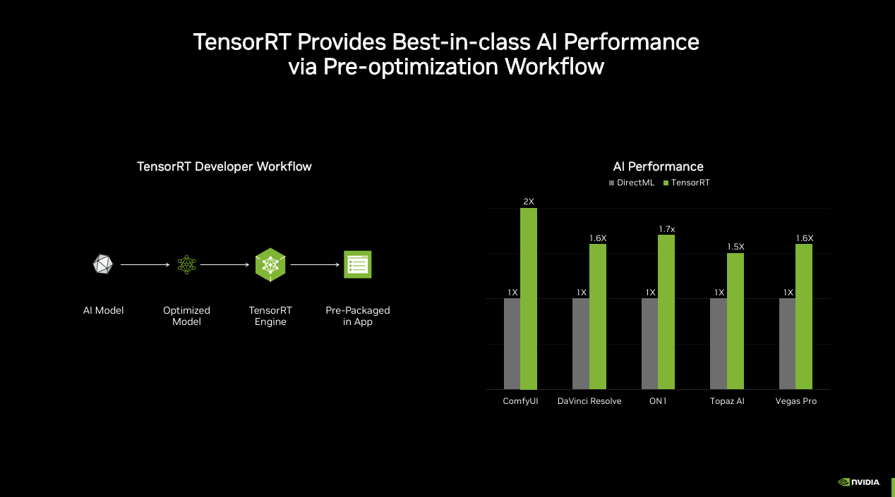 The Nvidia AI PC software stack now covers over 750 games and applications, making use of RTX GPUs' accelerating hardware. For instance, TensorRT still provides best-in-class AI performance with gains of up to 2x compared to DirectML. TensorRT for RTX will be available to developers in June, offering an optimised inference backend for PCs running AI applications.