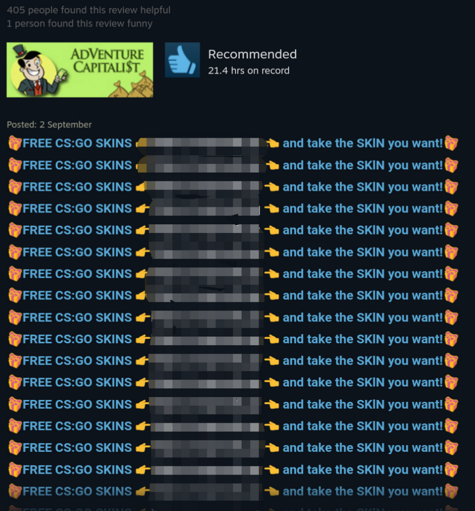 As pointed out on Reddit this week, CS:GO skin scammers are now promising ‘free skins' for the game in the reviews section for games on Steam and then using a series of bots to add ‘helpful' ratings to the review to boost the number of people it will be seen by.