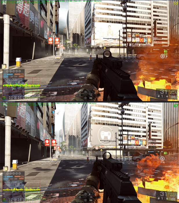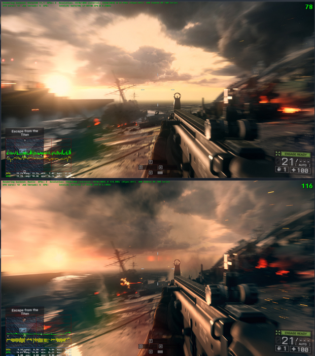The first test DICE ran used an AMD A10-7850K APU with no additional graphics card, the game was running at 720p with medium settings, while playing through the level ‘Singapore Beach' during the single player game. Mantle gave the APU a 14 per cent performance boost bringing the frame rate up from 39 frames per second to 43.