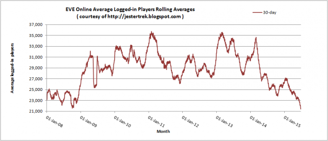 According to this graph made by a Eve Online player by the name of JesterTrek, the amount of concurrent players hit its lowest point since 2008 in January this year, with just over 21,000 players logged in at once. This is quite a bit lower than the January 2014 results, which topped in at around 33,000 concurrent players.