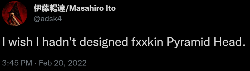 Konami's official Silent Hill website, silenthill.com, has been taken over by a fan after Konami failed to renew the domain. Now, the website leads to a screenshot of a tweet from Silent Hill 2 art director, Masahiro Ito, in which expresses regret for designing Pyramid Head:.
