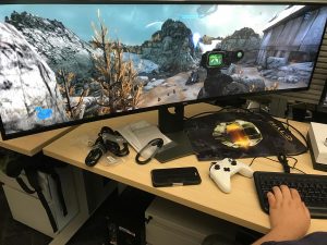 One configuration has the HUD centred in the middle of the screen, but with extra FOV extending out to the sides. The second spreads HUD elements out to the corners. The goal is to make both options available to players, so if you prefer to have your mini map and health closer to your eyes, then you have that option, but you can also push those elements out to appreciate more of the scenery.