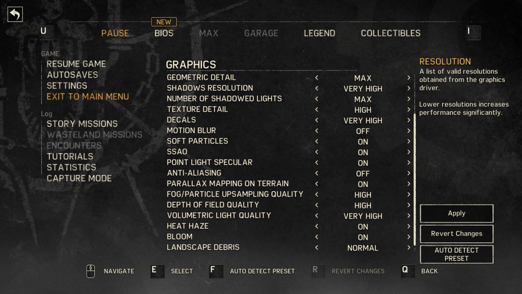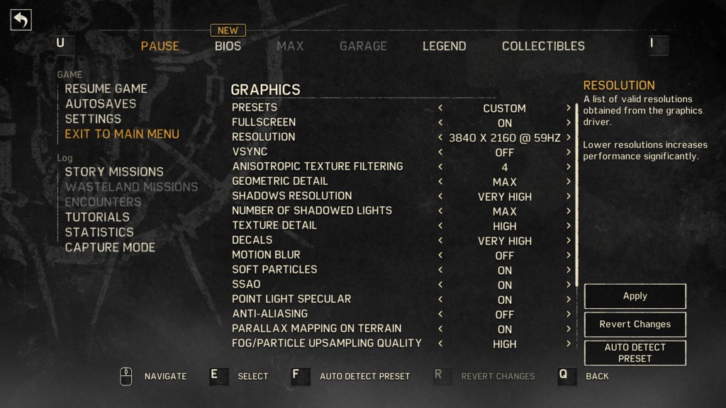 To kick things off, let's take a good look at the graphics options menu. It is clear that Avalanche Studios know what they are doing on the PC at this point. Just Cause 2 received a lot of support from the studio on the PC so this shouldn't be too surprising. Here in Mad Max, we have all of the options you could want.