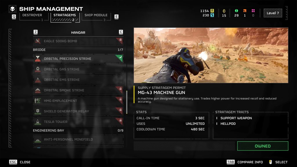 Strategems add a whole new dimension to the game. You aren't just going to drop in with the gear you have on hand and expect to come out of the mission alive. You will regularly want to take advantage of Strategems to call down ammo resupplies, powerful explosives and support weapons (like the sniper I mentioned earlier), or if you prefer, you can use a massive machine gun to tear enemies to shreds before they reach you. The list of strategems you can unlock is absolutely massive, so you'll want to think about which ones you are bringing depending on the mission you are planning on going on.