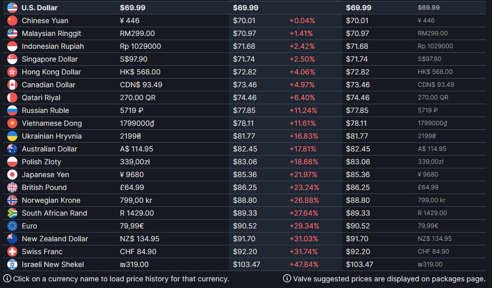 Looking at SteamDB, we can see that for whatever reason, the game is almost 48 percent more expensive in Israel, with the converted price working out to be $103.48 USD. Does Israel get some special version of the game with 48% more content to justify the extra expense over the US version? Absolutely not. The issue continues across a broad range of countries, with the game being almost 30% more expensive in Europe, 23% in the UK and 18% more expensive in Australia.