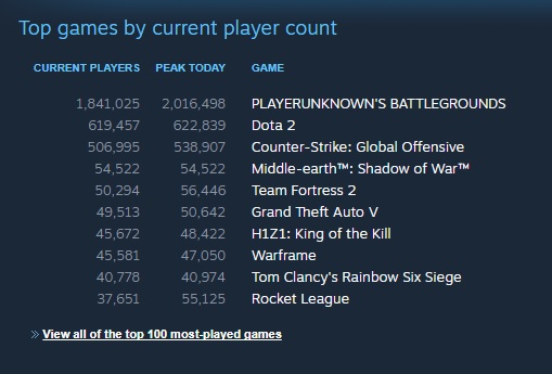 As you can see from the screenshot below, PUBG surpassed 2 million concurrent players today, practically dwarfing the player counts seen in the rest of the top ten.