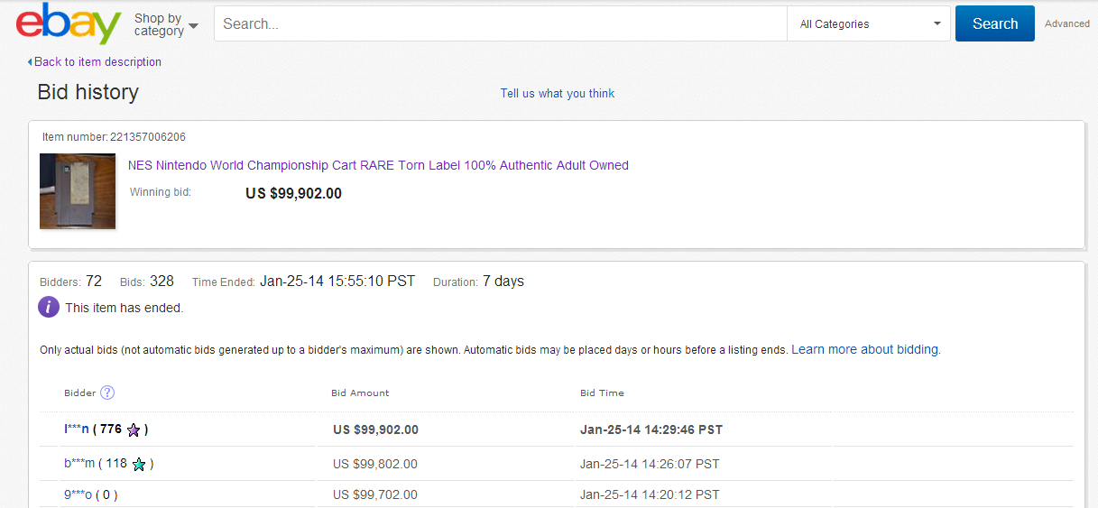 When the poor condition but still incredibly rare Nintendo World Championship NES cartridge hit eBay last week, word spread through the Internet quickly and unfortunately for the seller, that resulted in a series of not so serious bids which were swiftly met with retractions:
