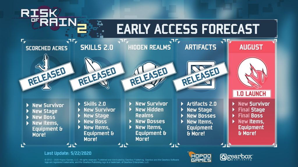 “What we wanted to make sure was that RoR2 1.0 was truly a complete game experience, and that means not only completing and fleshing out content, but improving and iterating on old features and content that’s been left behind. In order to meet goals of what a 1.0 version of RoR2 can be, we want to let everyone know we will be releasing 1.0 in August 2020.”