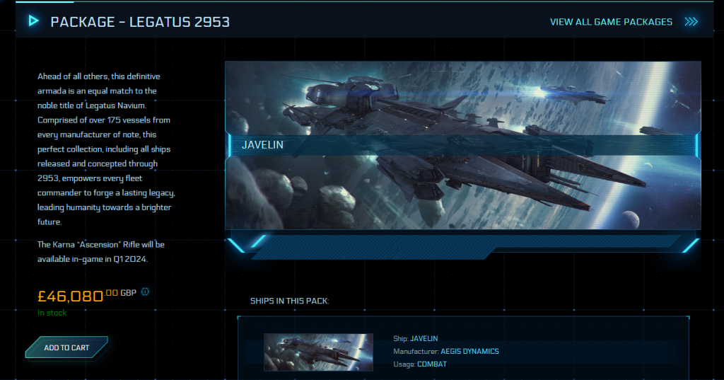 The new Legatus bundle has appeared on the Star Citizen website with a whopping $48,000 price tag. For that money, you get 175 ships, which works out to just under $275 per ship, which is almost equally as insane. Of course, this bundle includes a mix of high-end ships that would cost far more than $275, as well as the cheaper options available at much more reasonable prices. In the UK, the bundle costs just over £46,000.