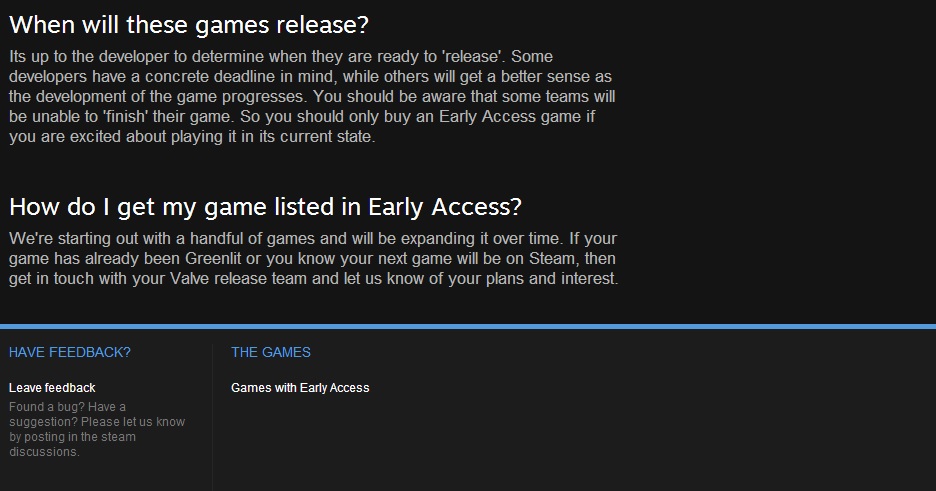 The Steam FAQ now answers the question: When will these (Early Access) games release?, with the following answer: “It's up to the developer to determine when they are ready to ‘release'. Some developers have a concrete deadline in mind, while others will get a better sense as the development of the game progresses. You should be aware that some teams will be unable to ‘finish' their game. So you should only buy an Early Access game if you are excited about playing it in its current state.”