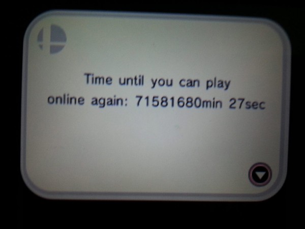 Smash Bros should typically ban people for 15 minute periods but those affected by this bug have been given messages informing them that they can't play online for 71,582,030 minutes- or 136 years.