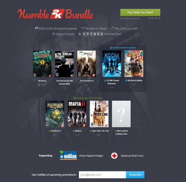 If you beat the current donation average ($7.41 at the time of writing) then you'll receive Bioshock II, Mafia II and Spec Ops: The Line, in addition to whichever games get added in to the bundle later on. If you pay $20 you'll also get XCOM: Enemy Unknown and Bioshock Infinite.