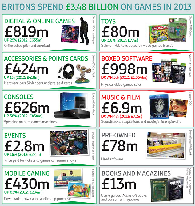 The UK gaming market generated £3.48 billion in 2013, which is a notable 20 per cent more than the year before. According to the latest statistics, almost every gaming industry sector grew dramatically throughout last year, with the exception of boxed software as well as music and film, which had a slight decline.