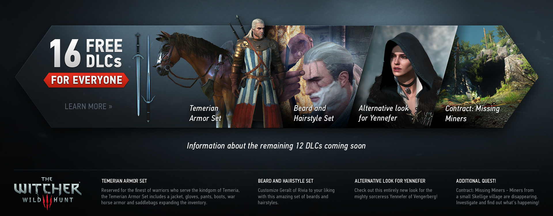 The first DLC bundle will be released on the 25th of February, containing a Temerian Armor set and a new beard and hairstyle set for Geralt. After this, a DLC bundle containing two new items will be released every week for free, regardless of having pre-ordered or bought after release. Instructions on how to obtain DLC will be published at a later date.