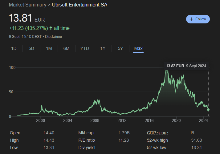 Ubisoft peaked back in 2018, with shares rising to around €100 per share. That means in the post-pandemic era, Ubisoft has lost over 80% of its market value.
