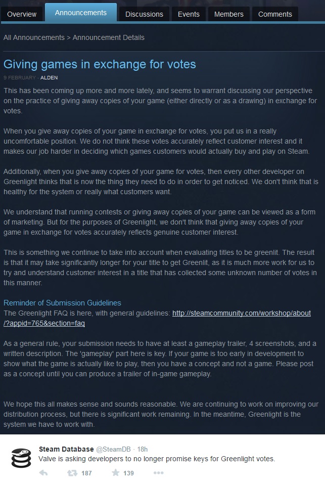 “Additionally, when you give away copies of your game for votes, then every other developer on Greenlight thinks that is now the thing they need to do in order to get noticed. We don't think that is healthy for the system or really what customers want.”