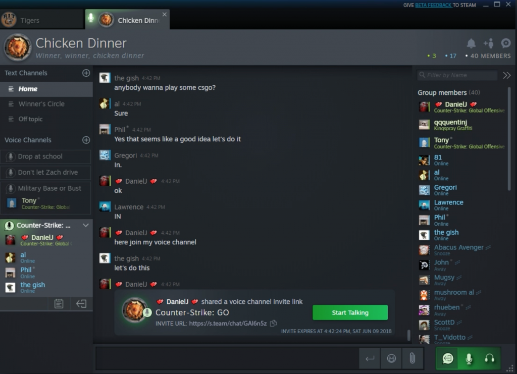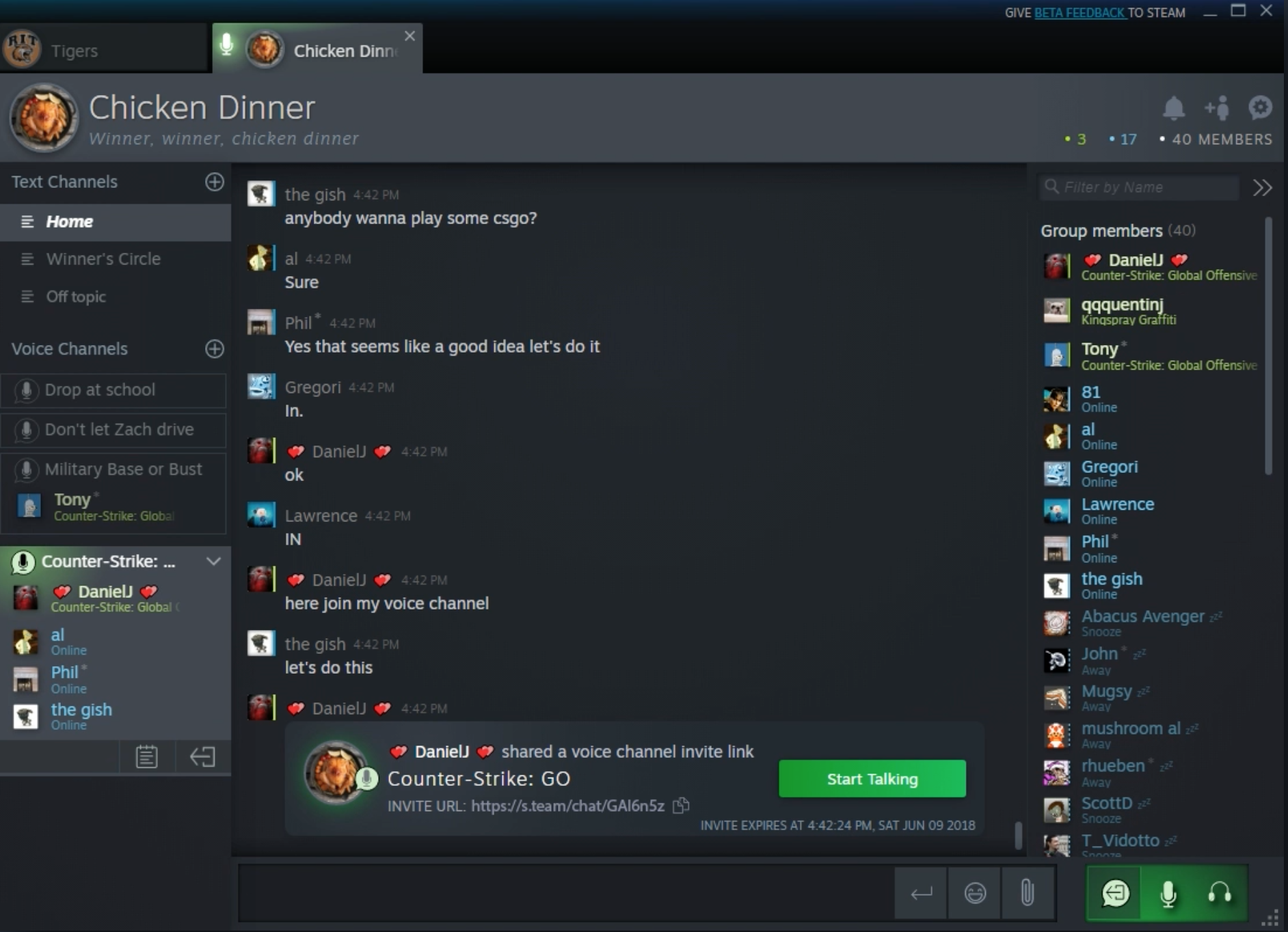 With the new Steam Chat, you can add favourite friends, groups, and chats to the top of the chat window for easy access. Online friends are now grouped by what game they are playing. You can also see what exactly a friend is doing in the game, whether sitting at the main menu or currently in a match. In addition, Steam Chat can now show you which of your friends are in a party together.