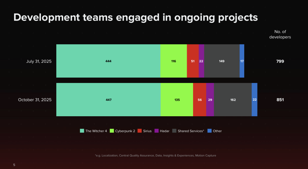 CD Projekt Red's Q3 earnings report is now live and as usual, the company included a graphic detailing how many developers it has assigned to each of its upcoming games. At this point, there are over 850 developers working across CDPR's studios. More than half of them are working on The Witcher 4, which is the game ‘closest' to release, although it is still unlikely to release before 2028.