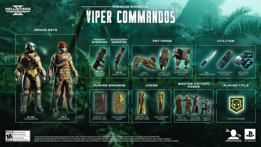 Arrowhead Studios recently revealed the next premium Warbond coming to Helldivers II. Set to arrive on the 13th of June, The Viper Commandos Warbond includes a bunch of cool new items, including a throwing knife; vehicle cosmetics; capes; armour; guns and more.
