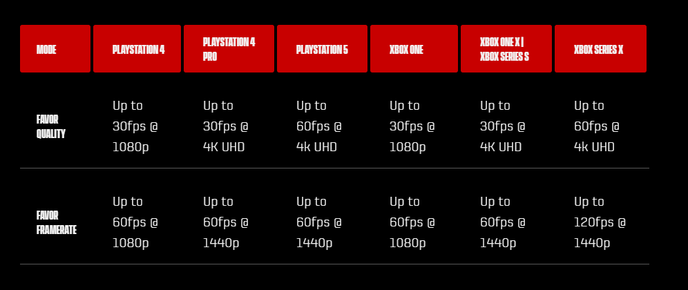 Across all consoles, the game will offer ‘favour performance’ and ‘favour resolution’ options. On the lowest end, the Xbox One and PS4 will run at 1080p 30fps or 1080p at a possibly less stable 60fps. Next up, the PS4 Pro, Xbox One X and Series S will run at either 4k 30fps or 1440p at 60fps. The PS5 manages 4k at 60fps, or alternatively 1440p at 60fps, which may sound odd – however it makes sense after looking at the Series X.